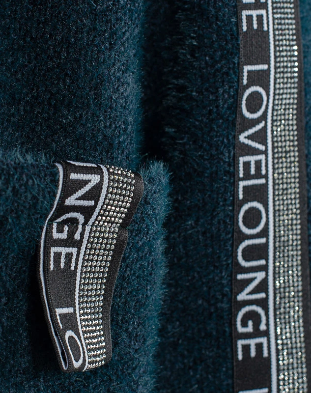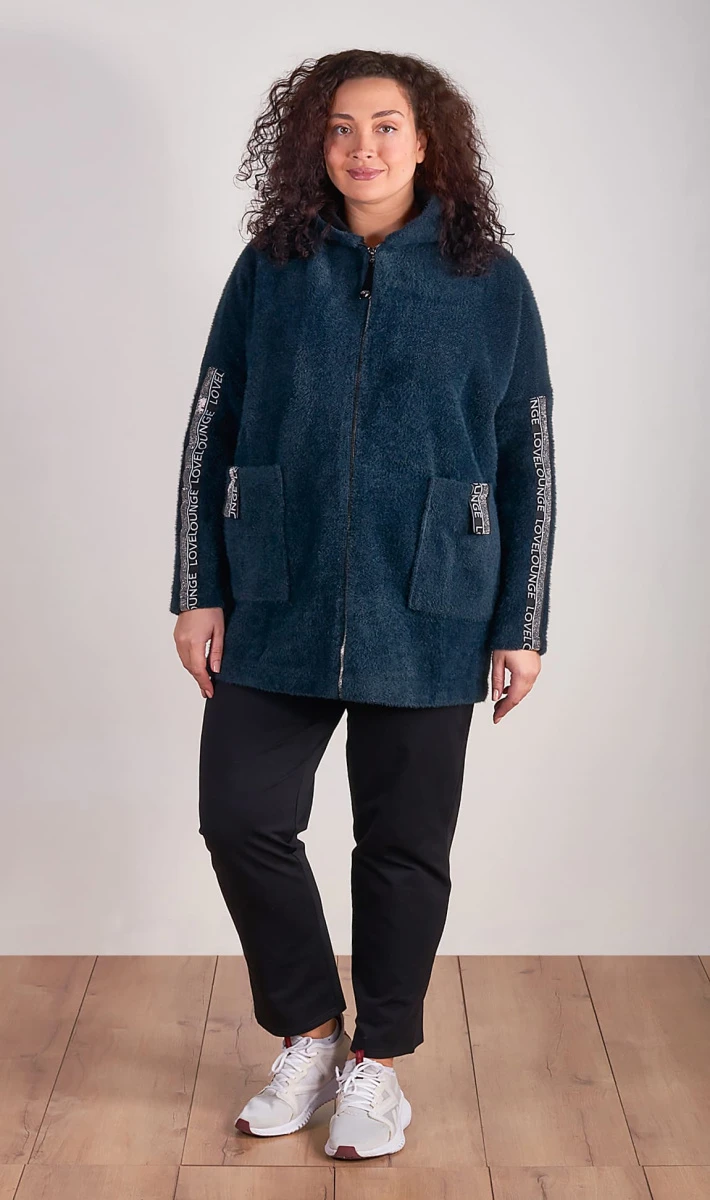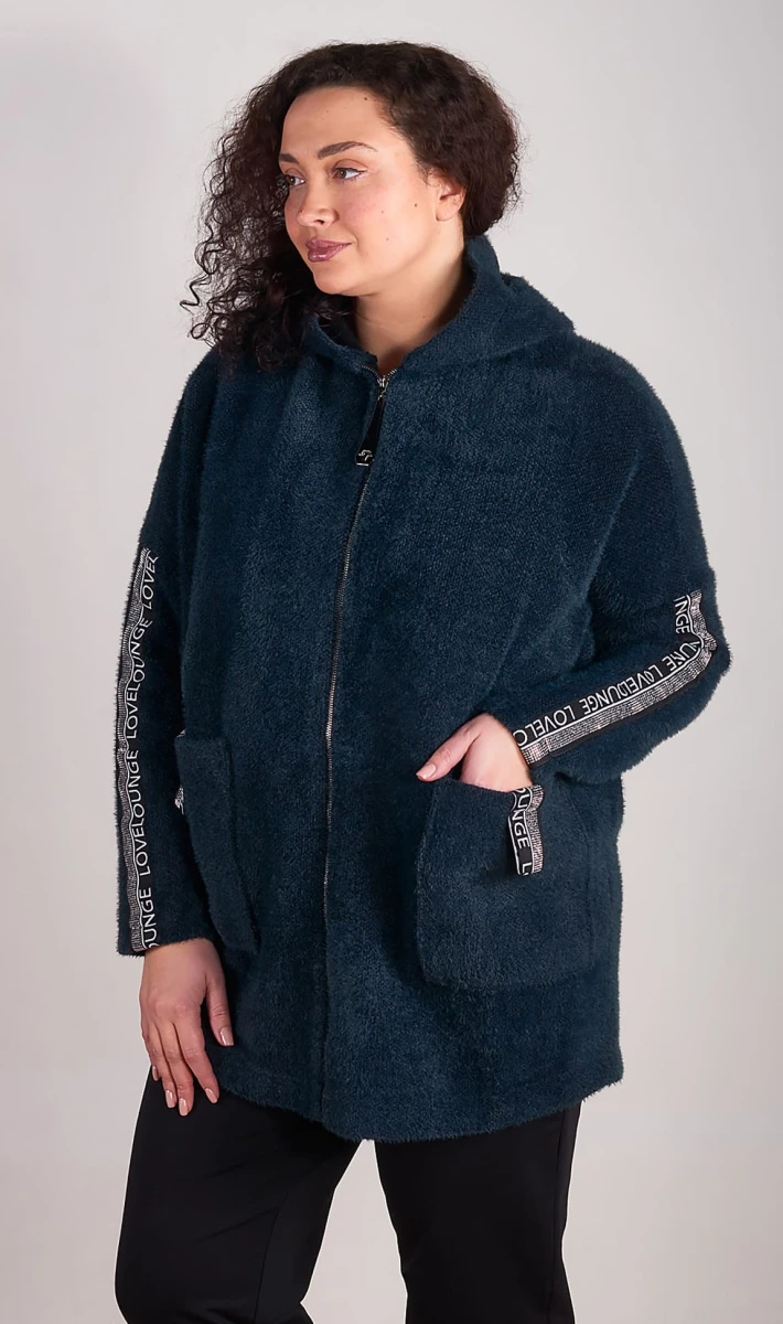 Стильный и модный кардиган, выполнен из тёплого и мягкого вязаного полотна. Без подклада. Линия плеча спущена, рукава оформлены тесьмой с надписью.