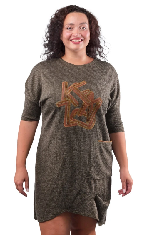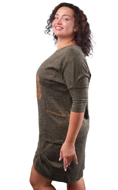 Модное и комфортное платье свободного кроя. Сбоку имеется карман и небольшая сборка. Аппликация выполнена частично из ткани, частично из кожзама. Рукав летучая мышь. Длина ассиметрична.