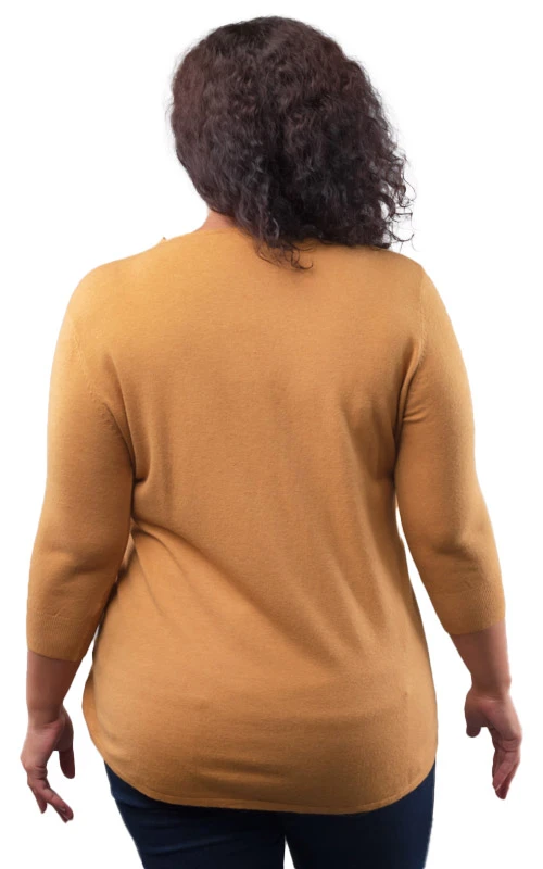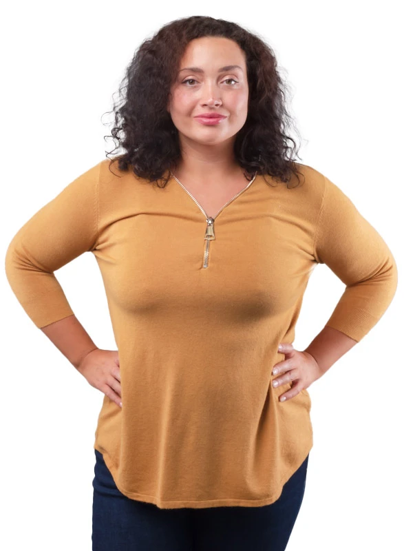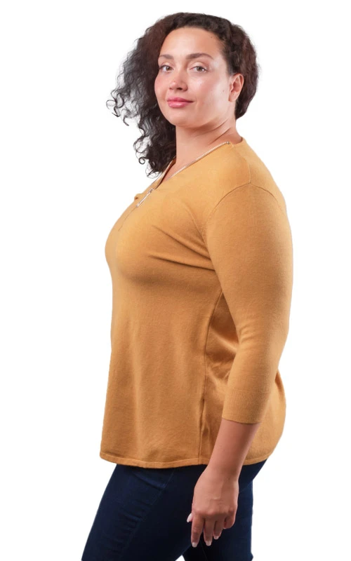 Красивый и тёплый джемпер полуприталенного силуэта. Рукав 3/4 на вязаной манжете. Молния функциональна, можно изменить размер выреза. Низ закруглённый. Длина изделия по спинке 71см.