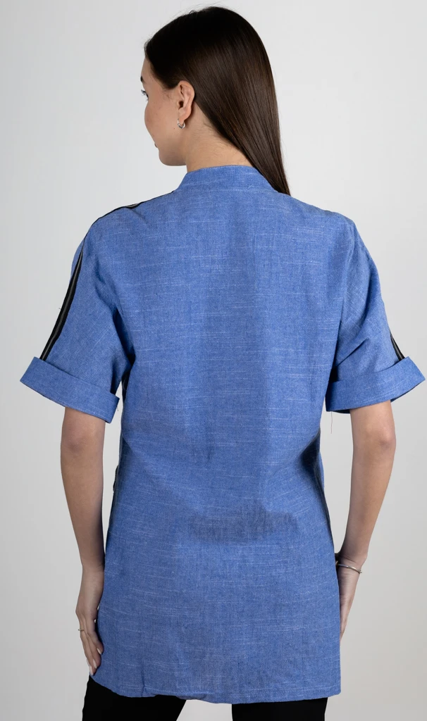 Легкая рубашка-туника с коротким рукавом на молнии. На плече лампасная тесьма. Брошь не плотно пришита.