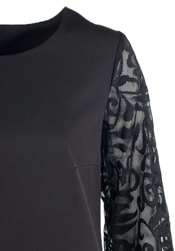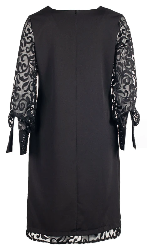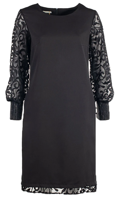 Платье прямого силуэта с втачным рукавом из гипюра. Платье выполнено из плательного материала. Манжеты рукавов оформлены стразами в цвет платья. В верней части переда нагрудные вытачки, по бокам карманы. Длина изделия 105 см.