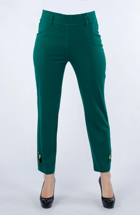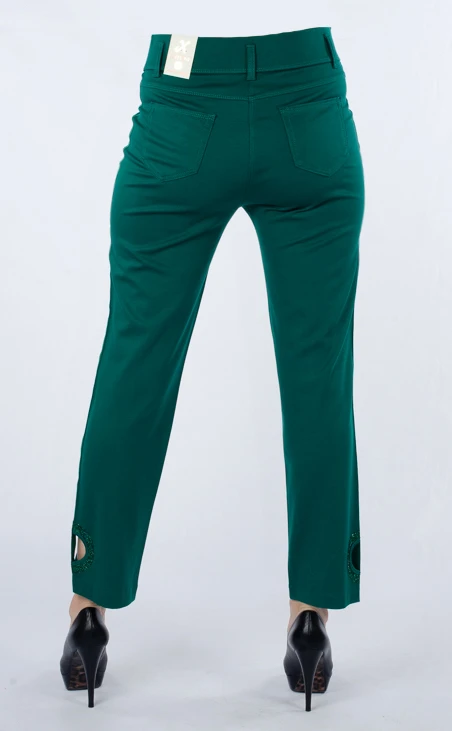 Боковая нижняя часть брюк украшена зелеными стразами.