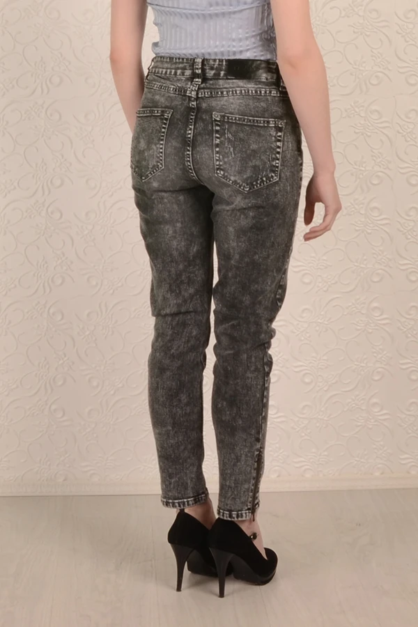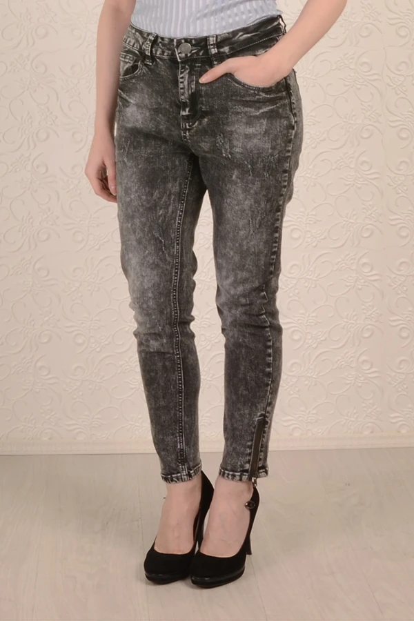 Темно-серые джинсы, со светло-серыми оттенками, зауженного кроя, подчеркивающего фигуру.
