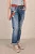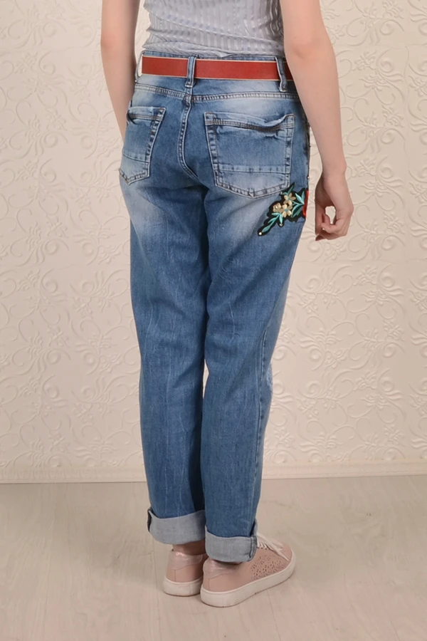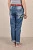 Синие штаны с плавными переходами в более светлые тона, свободного, прямого покроя, станут удобным приобретение, а аппликация небольшого букета цветов, обведенная широким, черным контуром добавит романтичности в образ.