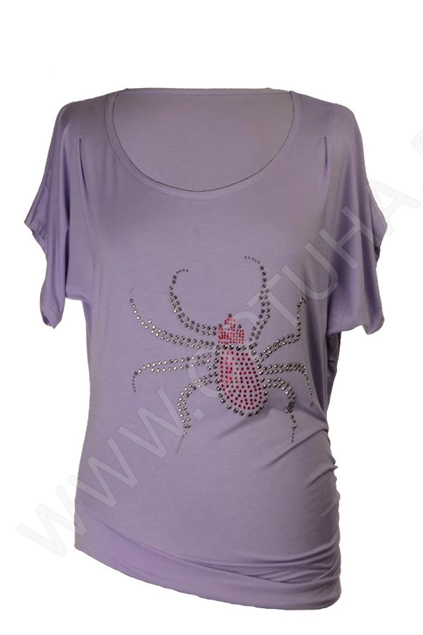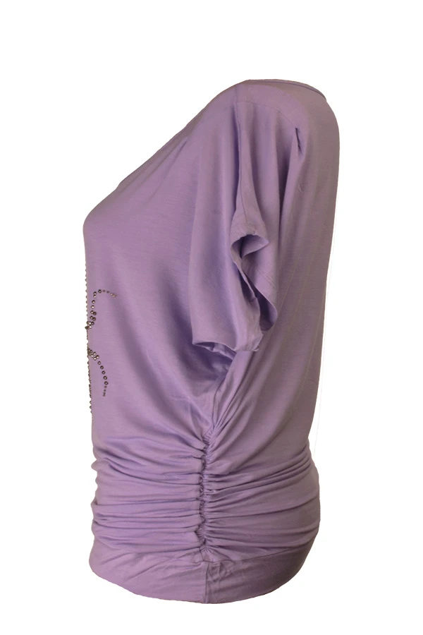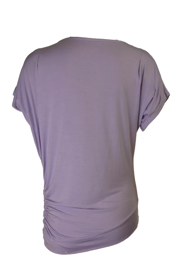 Фиолетовая свободная футболка, со сборкой на талии, позволяет своей хозяйке чувствовать себя защищённой, уверенной, так как объёмные модели свободного силуэта играют на создание нежного женственного образа, в котором пропорции тела сбалансированы.