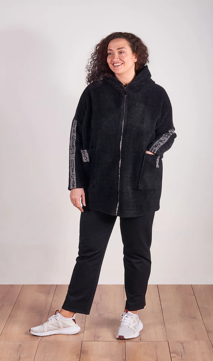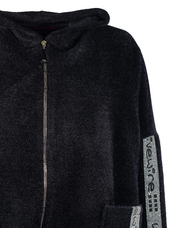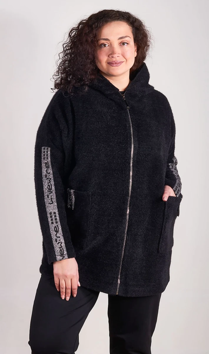 Стильный и модный кардиган, выполнен из тёплого и мягкого вязаного полотна. Без подклада. Линия плеча спущена, рукава оформлены тесьмой с надписью.