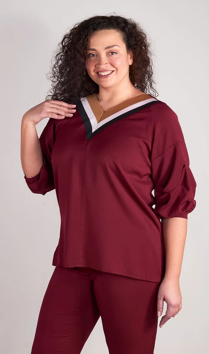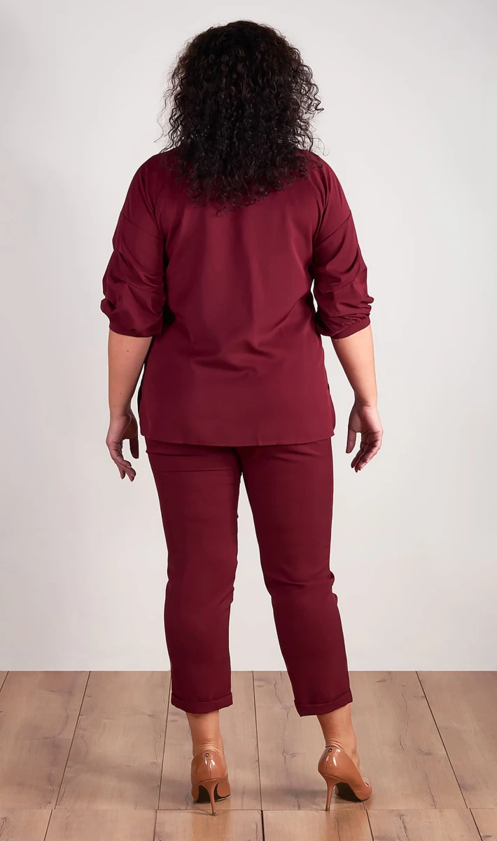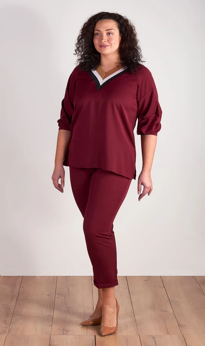 Универсальный брючный костюм из двух предметов станет незаменимым для вашего гардероба. Брюки по поясу на резинке, имеются карманы, к низу немного заужены, на отложной манжете.