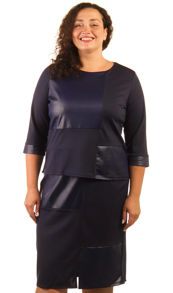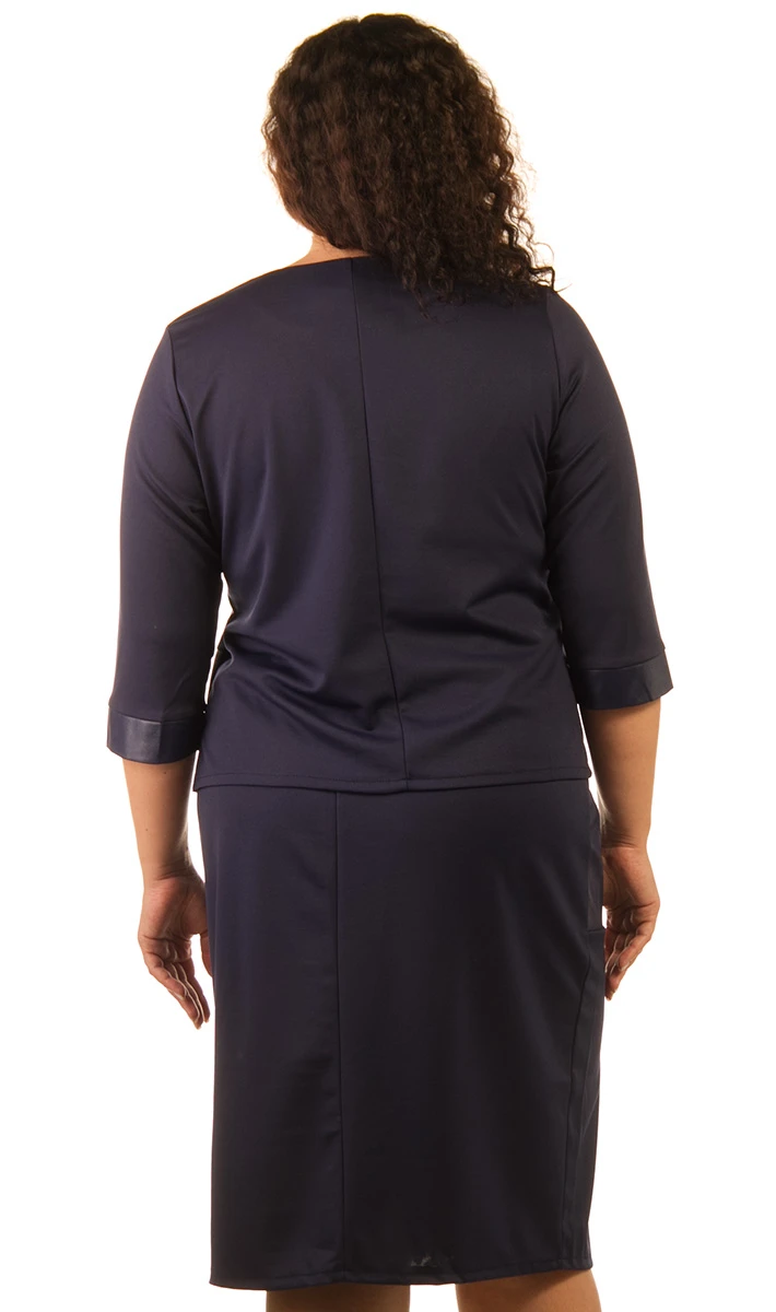 Комфортный юбочный костюм двойка полуприталенного силуэта. Костюм выполнен из трикотажного полотна. Передняя часть изделия комбинирована из полотна, имитирующего кожу. Блуза с нагрудными выточками. По бокам небольшие разрезы. Вырез горловины округлой формы. Рукав втачной, длиной до локтя, с притачными манжетами из эко-кожи. Юбка средней длины, на комфортном поясе-резинке. С левой стороны юбки расположен разрез. Эластичные материалы придают изделию практичность и функциональность. Костюм идеально садится на фигуру, имеет ряд больших размеров. Подойдет для работы, прогулок на природе и романтических встреч.
