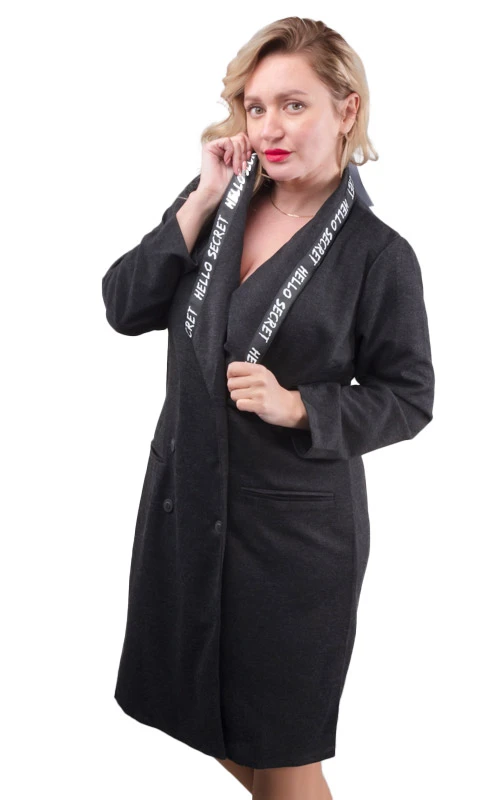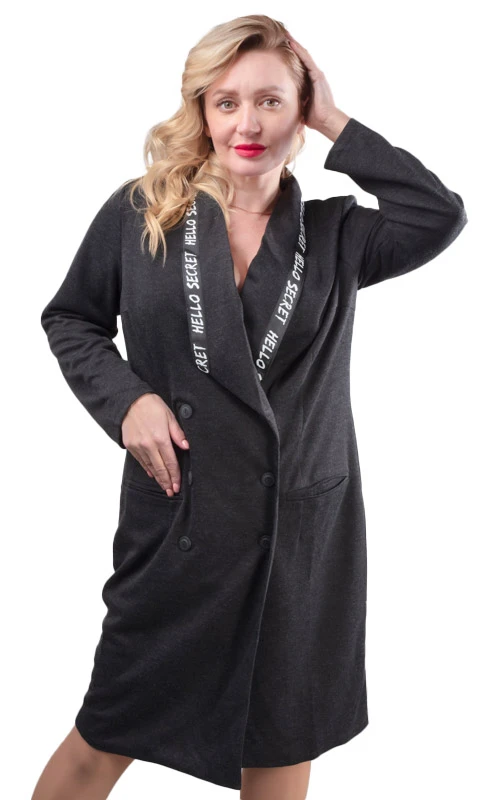 с двубортной застежкой на пуговицы. Трикотажное полотно средней плотности, что обеспечивает комфортную посадку на любую фигуру.
