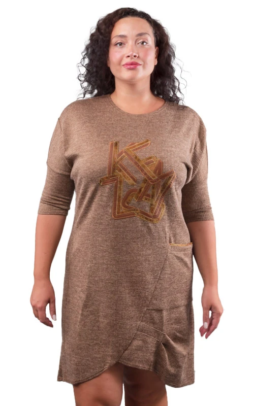Модное и комфортное платье свободного кроя. Сбоку имеется карман и небольшая сборка. Аппликация выполнена частично из ткани, частично из кожзама. Рукав летучая мышь. Длина ассиметрична.