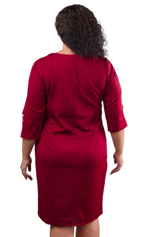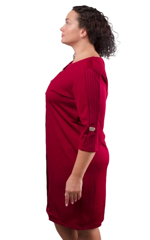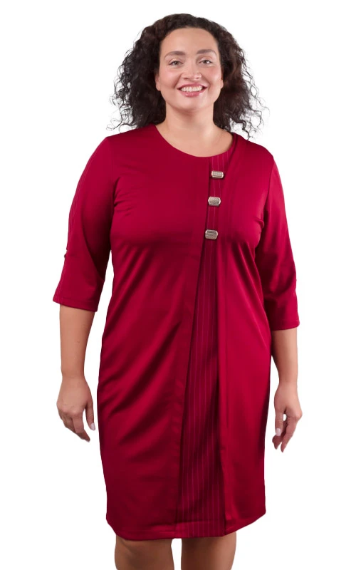 Передняя часть платья со вставкой полотна в полоску, дополнено тремя декоративными украшениями, которые гармонично дополняют образ.