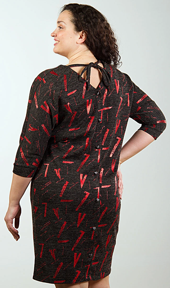 Платье оригинального полуприталенного силуэта из трикотажного полотна с интересным дизайнерским рисунком. Рукав цельнокроеный, с притачной манжетой. Спереди круглый вырез горловины, сзади горловина V-образная с завязками. Задняя часть платья с декорированной планкой с пуговицами. В боковых швах расположены карманы. Очень стильное, красивое и практичное платье. Практичный вариант на каждый день!