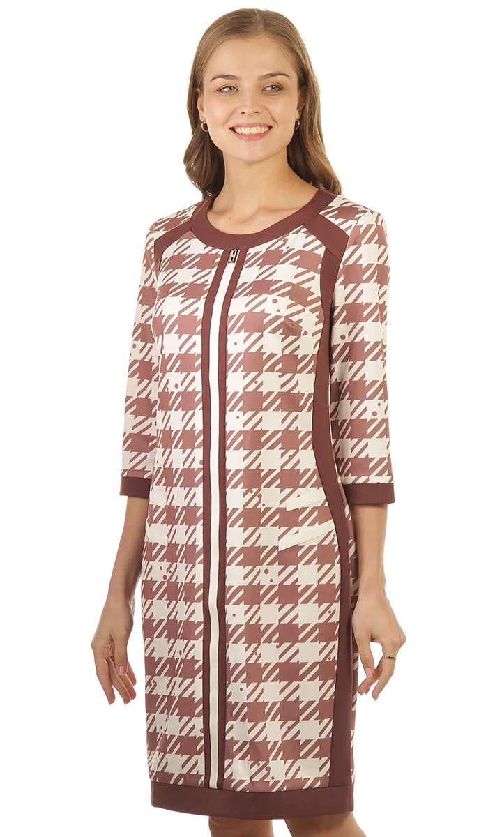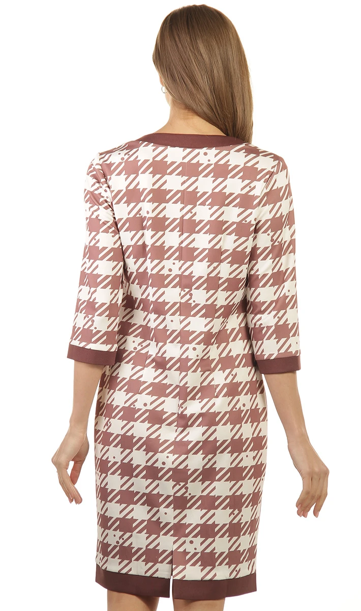 Стильное приталенное платье для повседневного гардероба - беспроигрышная инвестиция. Приятная на ощупь ткань с рисунком отлично сочетается с любыми аксессуарами. Горловина округлой формы. Рукав втачной одношовный, длиной 3/4. Спинка со средним швом, с талиевыми вытачками и разрезом. Контрастные канты, словно графический рисунок, оформляют образ, придавая ему динамики. Очень стильное, красивое и практичное платье. Практичный вариант на каждый день!