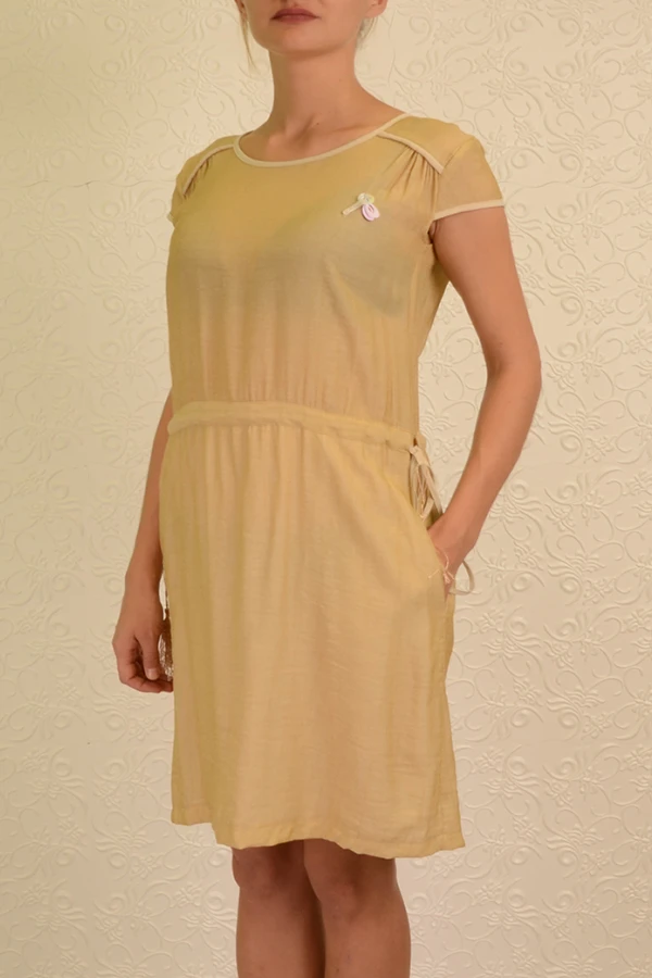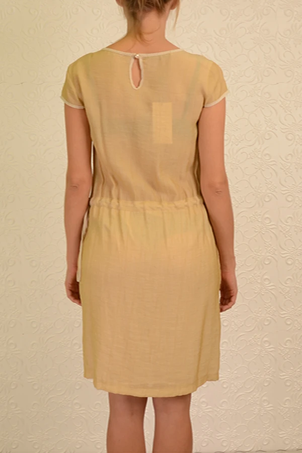 Платье из приятного к телу невесомого материала с коротким рукавом. На талии регулируемая кулиска. Края горловины и рукавов обработаны тесьмой на тон светлее изделия.