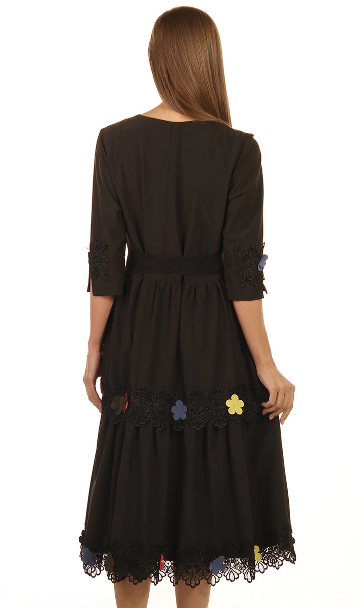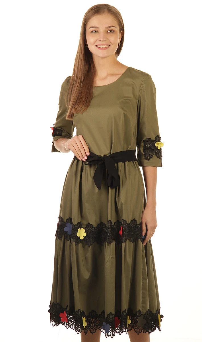 Модель маломерит на размер. Романтичное однотонное платье, А- силуэта, украшено кружевом и аппликацией в виде цветов. Нарядное ярусное платье сделает любую девушку неотразимой и привлекательной. Горловина овальной формы. Перед с нагрудными выточками. Рукав втачной, длина ¾. В боковых швах расположены карманы. Воланы на юбке придают неизменно яркую индивидуальность. Низ платья и рукавов украшены кружевом. Прилегание можно регулировать съемным поясом контрастного черного цвета. Данная модель подходит для девушек и женщин высокого и среднего роста. Отличный вариант для женщин на юбилей, праздник, торжество!