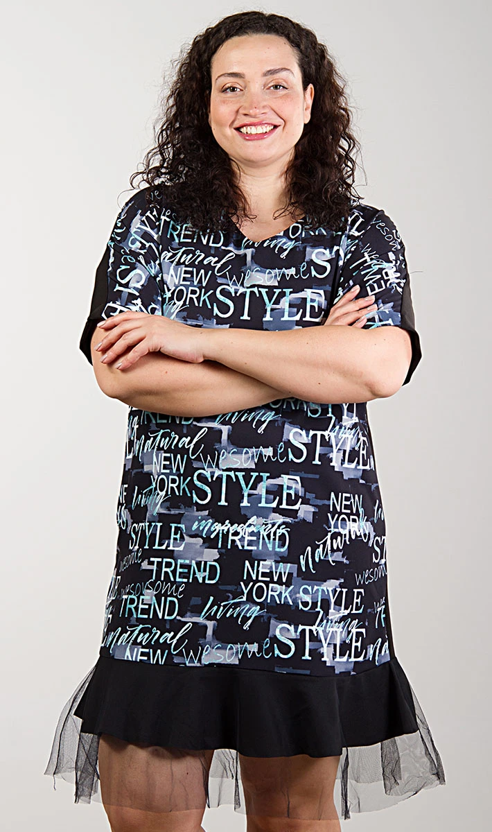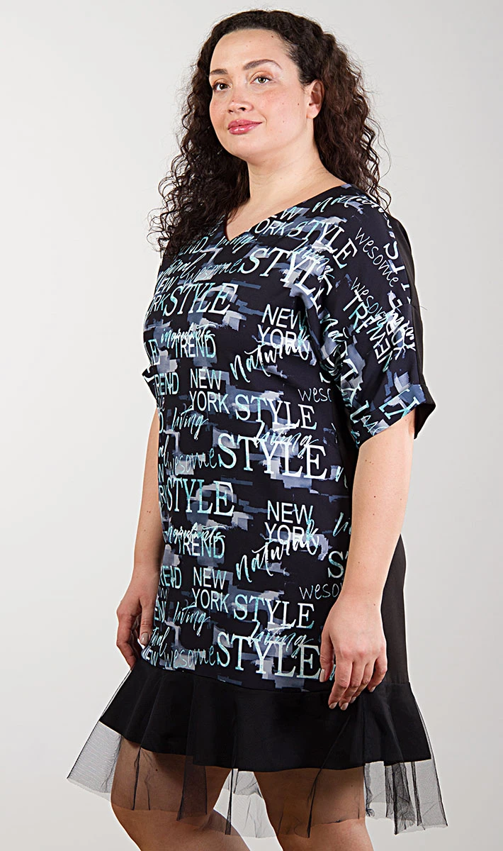 Стильное платье с принтом-надписями из плательного материала, прямого свободного кроя. Платье прекрасно впишется в ваш гардероб, отлично может сочетаться с различной одеждой и обувью. Рукава цельнокроеные, со спущенным плечевым швом. Застёжка потайная молния в боковом шве. Низ оформлен двойным воланом; из основной ткани и сетки. Спинка цельная, однотонная. Простое, но такое комфортное изделие станет одним из ваших любимых! Практичный вариант на каждый день!