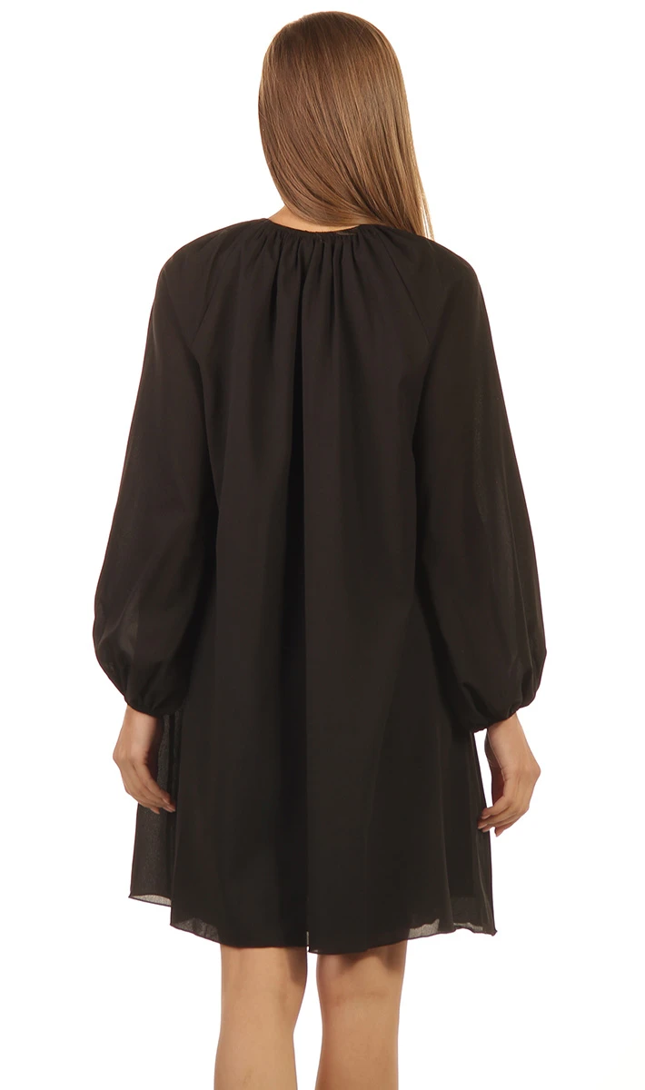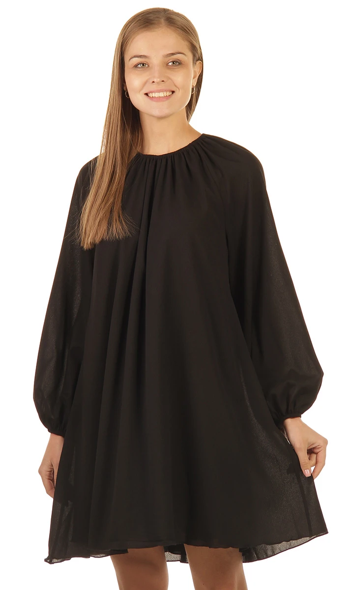 Романтичное, однотонное платье-туника из текстильного материала. Изделие двухслойное, свободного силуэта трапеция черного цвета. Горловина круглой формы, на резинке. Рукава реглан, длинные, заканчиваются резинкой.
