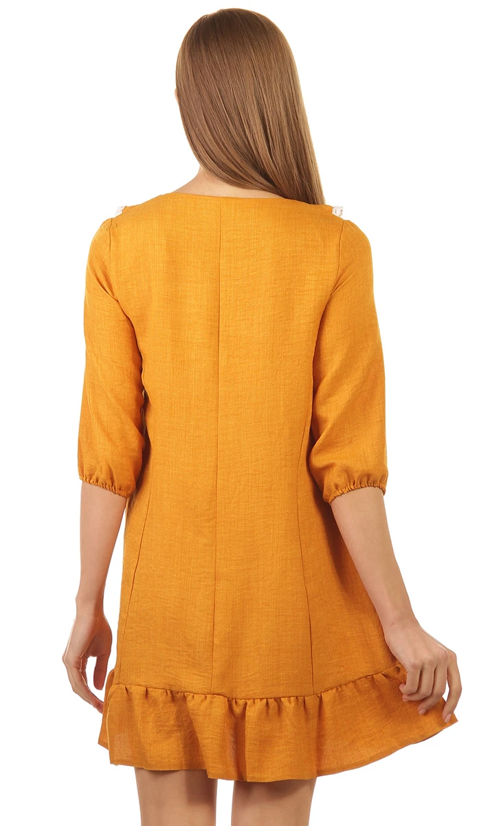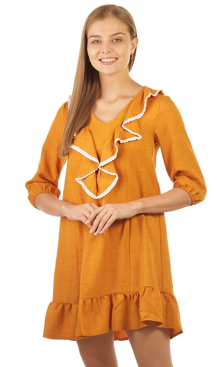Очаровательное мини платье с игривыми оборками, рюшами и кружевами. Вырез горловины V-образный, дополнен оборкой, украшенной нежным кружевом. Рукав втачной, длиной ¾, по низу собранный на резинку. Платье с рельефными швами переда и спинки. Низ оформлен оборкой. Само платье свободное и легкое!