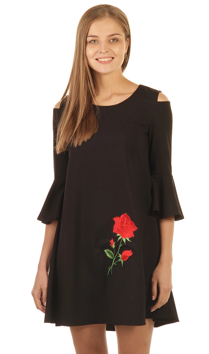 Вырез горловины - круглый. Рукава короткие. Вид застёжки - молния. Платье украшено дизайнерской вышивкой в виде розы. Эффектное платье не оставит вас незамеченной!