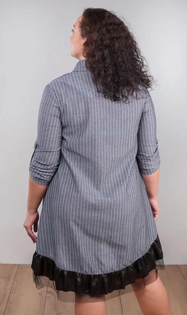 Ультрамодное платье-рубашка выполнено из дашащего текстильного материала. Длина рукава 3/4 с пуговицей и патой. Ворот рубашечный. Длина асимметрична, задняя часть округлая. Низ платья декорирован воланами из чёрного материала и сетки.
