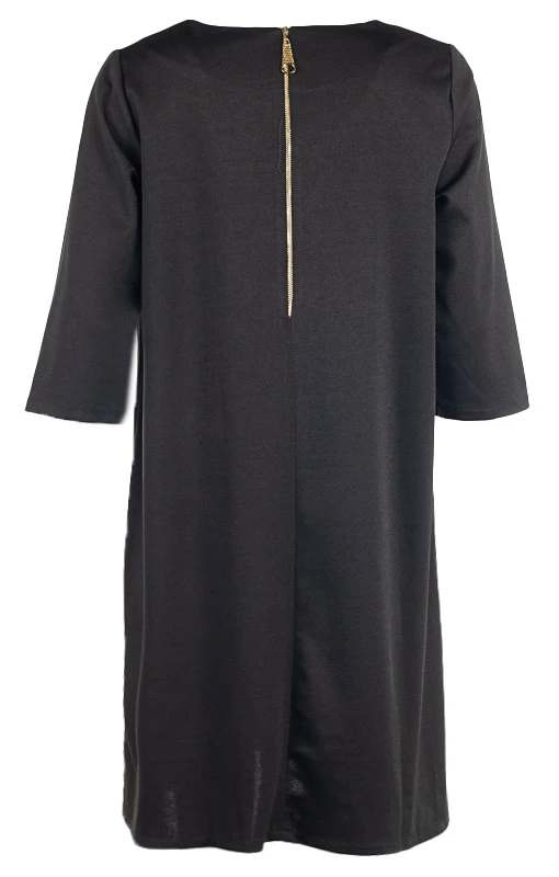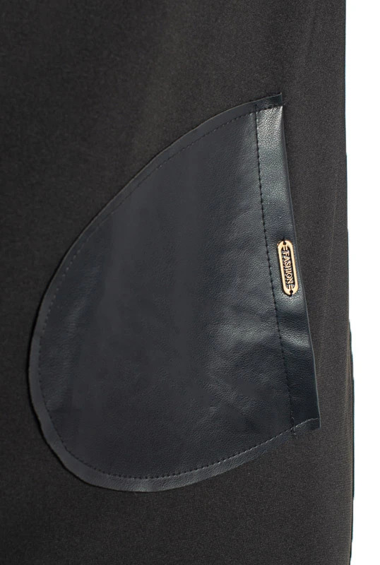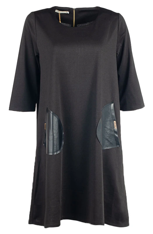 Платье трапециевидного силуэта с втачным прямым рукавом, длиной 7/8 . Платье выполнено из трикотажного дышащего материала. Имеются два накладных кармана из кожзам. Длина изделия 96 см.