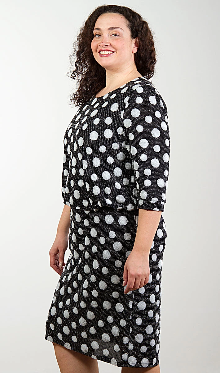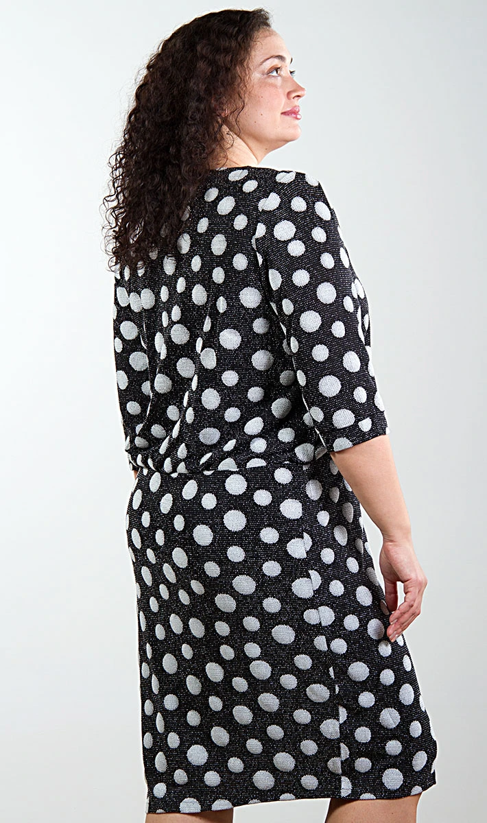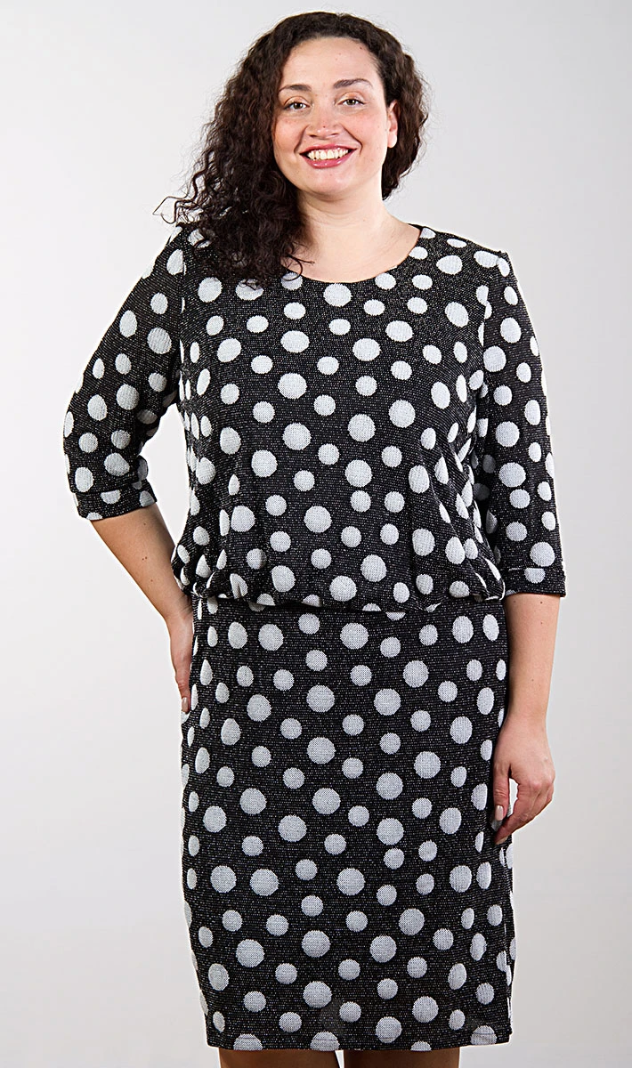 Платье полуприталенного силуэта из эластичного материала с небольшим количеством люрекса. Платье в крупный белый горох, с напуском по линии талии. Рукава втачные, длиной ¾ с притачной манжетой. Круглый вырез горловины. Очень стильное, красивое и практичное платье.