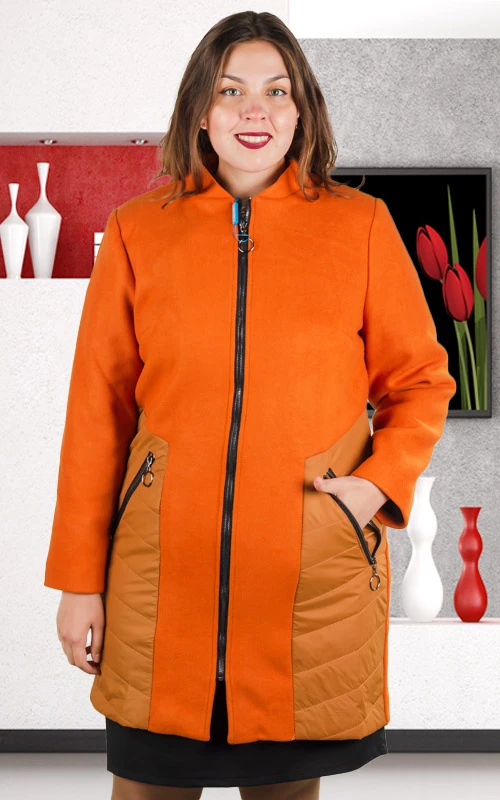 Пальто с подкладом, без утепления. Параметры размеров: Размер 50 ОГ=102 ОТ=104 ОБ=110 Длина по спинке=86 Размер 52 ОГ=104 ОТ=106 ОБ=112 Длина по спинке=87 Размер 54 ОГ=108 ОТ=110 ОБ=118 Длина по спинке=88